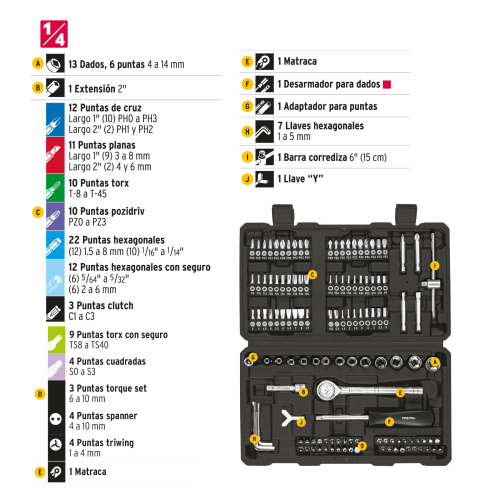 JUEGO DE 130 HERRAMIENTAS 1/4. PARA MECANICO, PRETUL